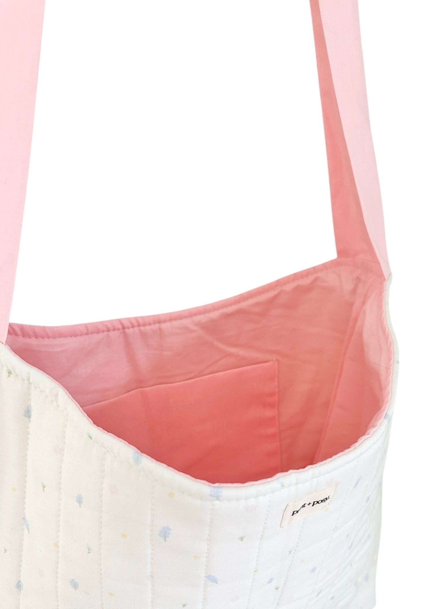 It is made with a 100% cotton outer and lining with a soft, slightly padded interior and can be worn as both a tote or crossbody bag.
